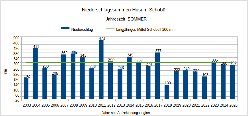 Der August 2025 war anfangs etwas zu warm, dann ab Mitte des Monats zu kalt. Der Einfluss einer Hitzewelle reichte nicht bis ins nördliche SH, auch die mitgeführten Gewitterlagen beeinflussten unseren Raum nur wenig. Tiefs über Südskandinavien bescherten uns in der ersten Monatswoche ergiebigen Regen. Danach reichte es oft nicht einmal zu messbaren Niederschlägen ( wenig wirksame Tiefausläufer ). Temperatur und Sonnenschein bewegten sich in einem freundlichen Auf und Ab. Erst zum Ende des Monats setzte sich wieder niederschlagsreicheres Wetter durch.