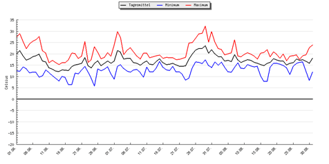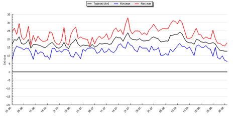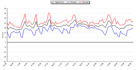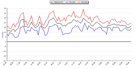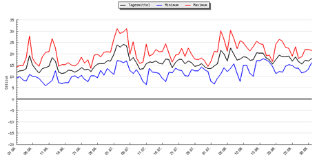 Hitzespitzen Anfang Juli und Mitte August - dazwischen teils kühle Juliwochen.